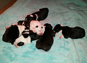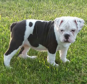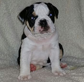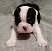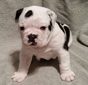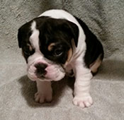 | Olde English  Bulldogge  - 3 puppies born Apr. 4, 2014. 2 males and 1 female. One male is tri color and one is black and white and the female is a white and black. Sire: Benson Dam: Violet | |||